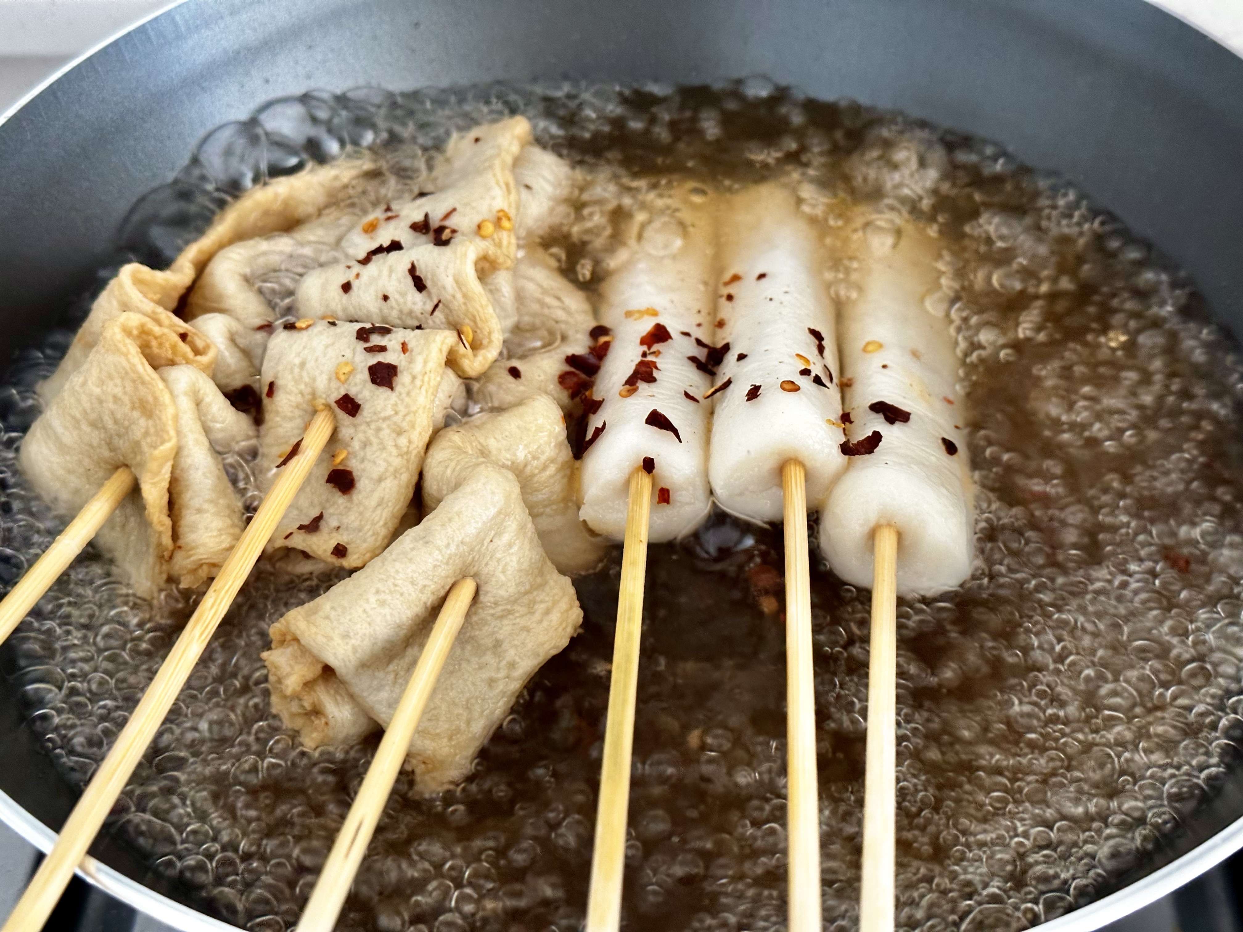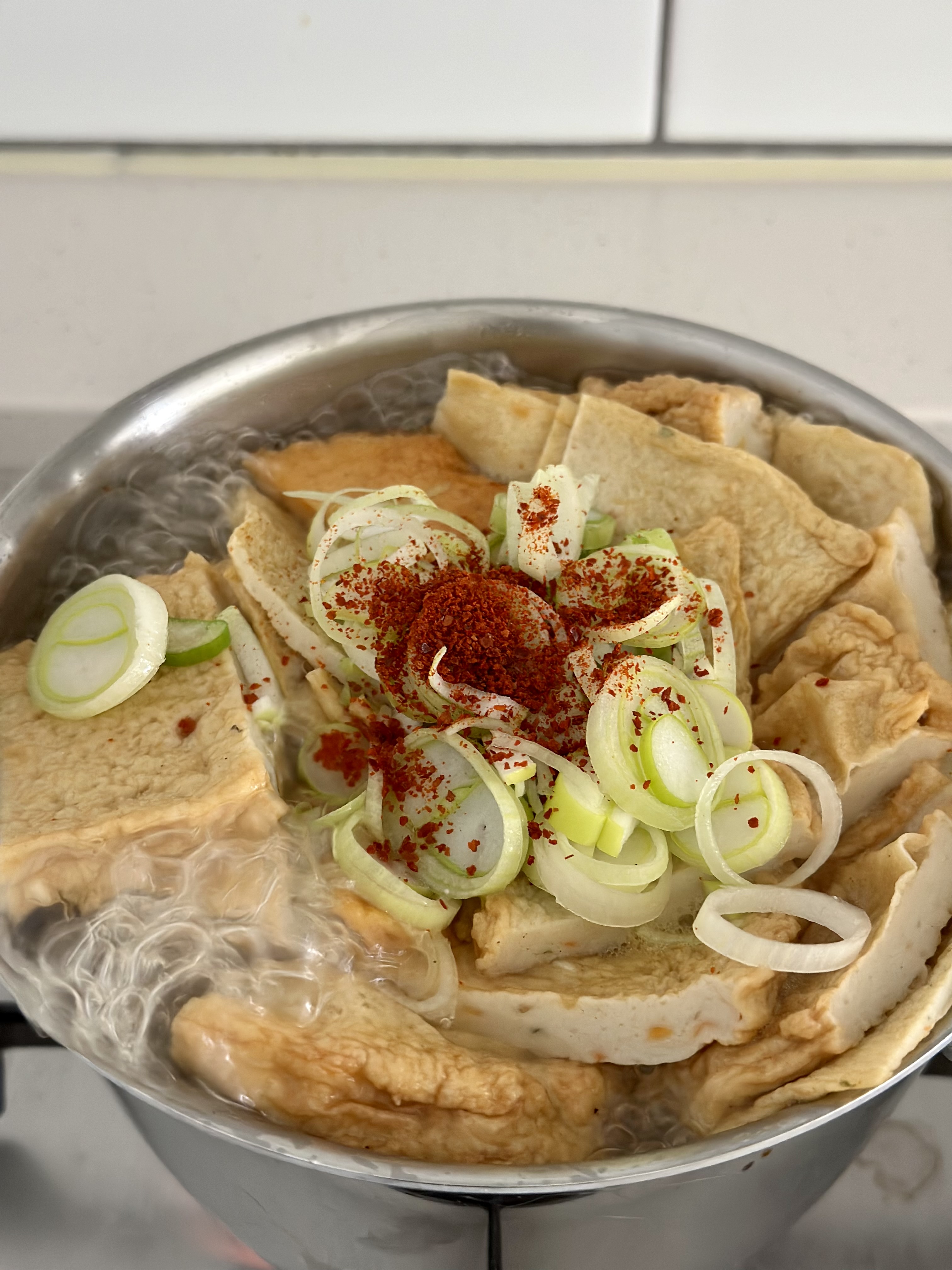 먼저 낮은 냄비에 액상스프와 물을 끓입니다. 물이 끓으면 어묵과 떡을 넣고 5분간 더 끓인다.