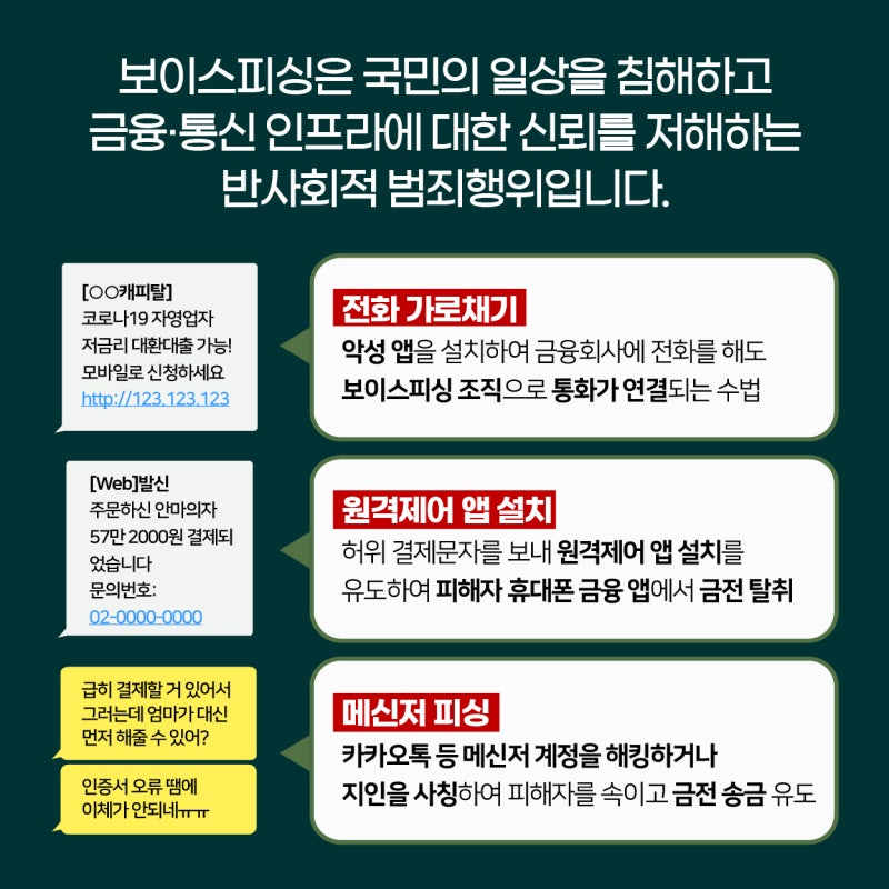 보이스피싱 사건 발생 당일 범인의 작업을 시간순으로 적어보면 부모님의 휴대폰 보이스피싱 예방 아이디어가 떠올라 공유합니다.이 작업 절차가 모방 범죄로 악용되지 않기를 바랍니다.보이스(메신저) 피싱 범행 작업 순서 – 이 순서는 저희 어머니의 경우이므로 다른 피해자분들과는 다를 것입니다.2022.03.26 11:26 문자발송 12:07 답변온 휴대폰 통화 / 문자 대화 12:27 피해자 신분증 사진 보내기13:01 카카오톡으로 원격제어 앱 링크 업로드.