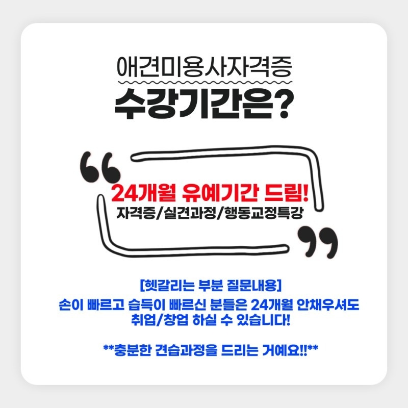 온라인강의와 원데이클래스는 기본에 집중해서 조금 아쉬웠지만, 평생학습센터 과정은 원장님께 가위 잡는 법, 애견 손질에 필요한 기술까지 직접 배울 수 있어서 좋았습니다. 현재 현장에 있습니다. 애견미용 자격증을 취득하지 않고도 저렴한 비용으로 애견 셀프그루밍을 배우고 싶다면 꼭 추천드립니다!!