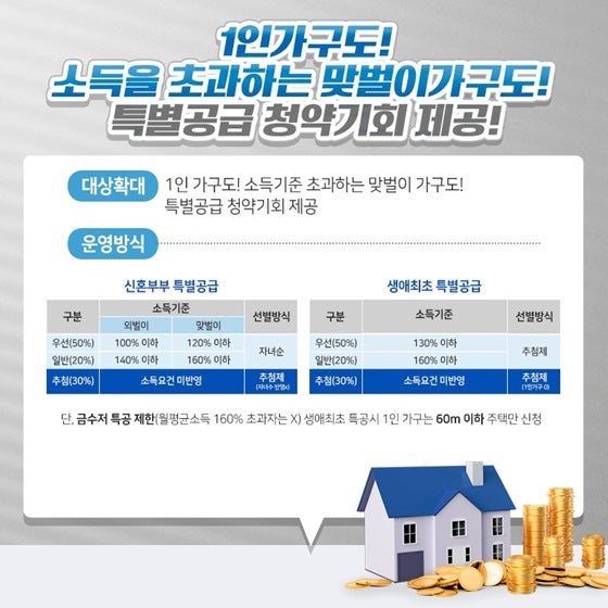 ◆면적/세대비율 : 전용 85㎡ 이하 / 9% (국유지 18%)◆결혼한 분 또는 미혼자녀가 있는 분 / 과거 주택소유 이력이 없어야 함 / 가구원 1인당 월평균소득 160% 이내 / 현재 소득 또는 지난 1년 이내 소득세 납입 증빙이 가능한 분 / 5년 통산 소득세 납입 증빙 필수 / 신생아 우선 공급 / 미혼자 추첨제 (30% 배정, 월평균소득 160% 또는 자산 3억 3,100만원)◆계좌가입기간 : 24개월 이상◆주의사항 : 무주택 세대원 / 1순위 조건 충족 / 배우자가 결혼 전 주택소유, 당첨불가