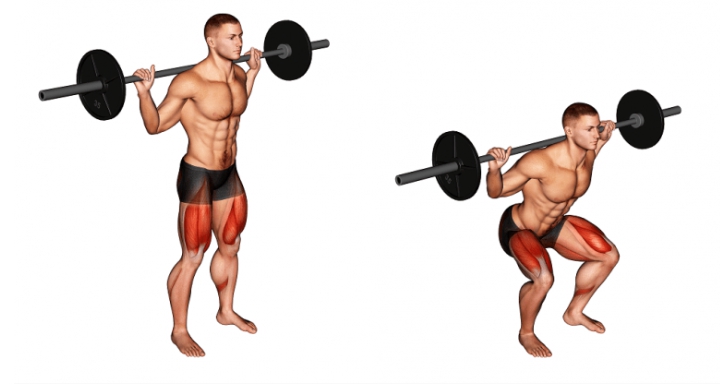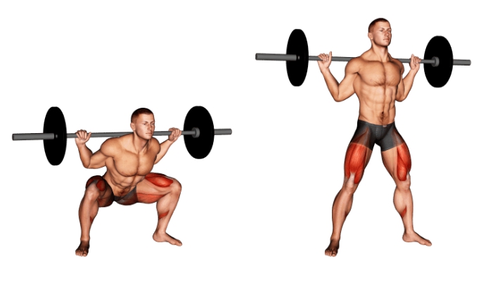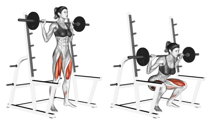 전형적인 스쿼트 자세는 발을 어깨 너비만큼 벌리고 대퇴사두근, 햄스트링, 고관절 내전근 및 외전근을 목표로 하는 움직임을 포함합니다.
