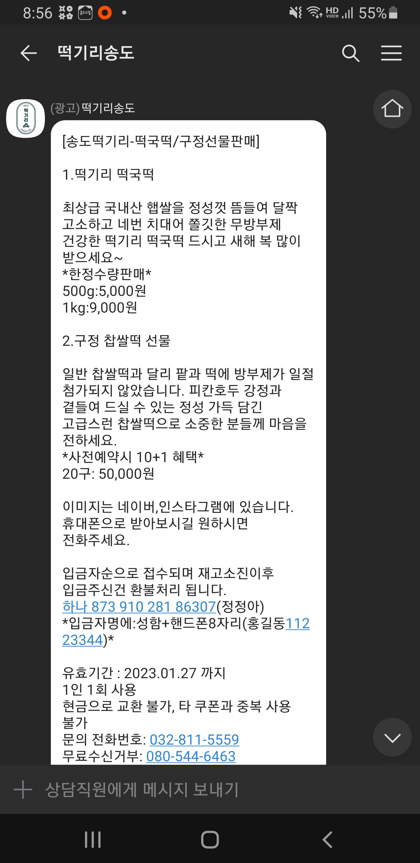 떡국떡을 사고 싶었는데 아래와 같은 문자가 와서 먼저 입금을 했습니다.