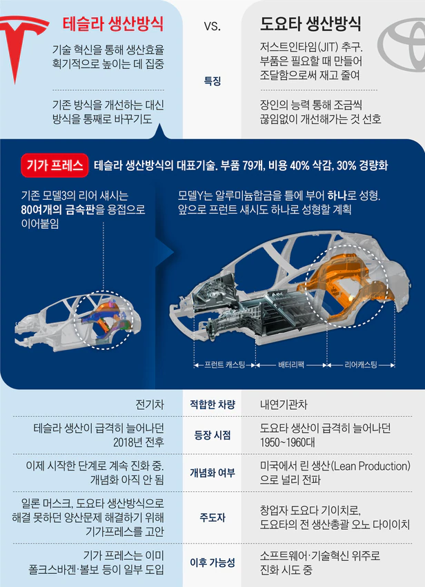 테슬라가 빠르게 생산량을 늘릴 수 있었던 이유 중 하나는 ‘기가프레스’ 기술입니다. 알루미늄을 녹인 액체를 금형에 부어 전체적으로 거대한 부품을 주조합니다. 테슬라는 자사에서 가장 많이 팔리는 ‘모델Y’의 리어 샤시(차량의 뼈대인 샤시)를 만든다. 70여개의 금속판을 용접하여 만들던 것을 하나의 주물로 교체. 즉, 자동차 제조가 장난감 자동차처럼 변화하고 있습니다. 복잡하고 시간이 많이 소요되는 용접 공정을 제거하여 대폭적인 비용 절감, 경량화, 공정 단축 및 품질 향상을 목표로 했습니다.. Tesla에 따르면 섀시 구성 요소의 제조 비용은 40%, 무게는 30% 감소했습니다.