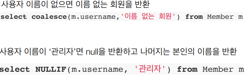 [JPA] 조건식 2023년 03월 10일 by issue 조건식 – CASE 식 표준 CASE 표현 간단한 CASE 표현 '추천 관련글, Coroutines 기초 알아보기해외선물투자방법 : 매매절차, 결제, 위험관리숙취해소제 삽강훈 숙취두통이 뭐예요?[Chatgpt활용 영어공부 방법] COALESCE: 한 번에 하나씩 조회하고 null이 아니면 반환 NULLIF: 두 값이 같으면 null을 반환하고 그렇지 않으면 첫 번째 값을 반환합니다. 원천 : https://www.inflearn.com/course/ORM-JPA-Basic